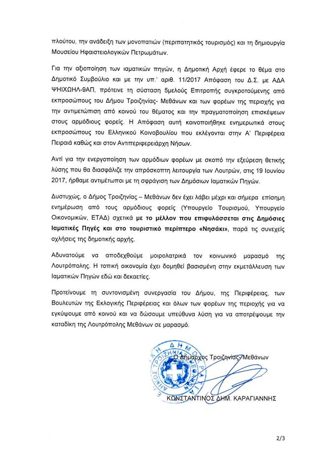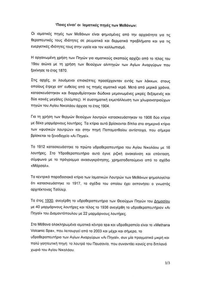 Το υδροθεραπευτήριο "'Αγιοι Ανάργυροι" που λειτουργεί μέσα στο ξενοδοχείο "ΑΙ ΠΗΓΑΙ" στην είσοδο της Λουτρόπολης των Μεθάνων θα αρχίσει να λειτουργεί για την εφετινή καλοκαιρινή σεζόν το Σάββατο 10 Ιουνίου. Εντός του ξενοδοχείου ΑΙ ΠΗΓΑΙ λειτουργεί το