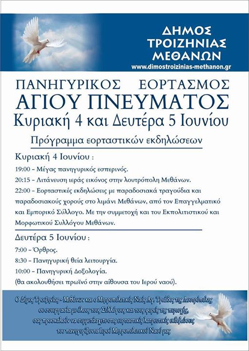 Ο Επαγγελματικός & Εμπορικός Σύλλογος Μεθάνων διοργανώνει εορταστικές εκδηλώσεις με ζωντανή μουσική απο το συγκρότημα ΣΥΝΤΟΝΟΝ,με παραδοσιακά τραγούδια και χωρούς για τον πανηγυρικό εορτασμό του ΑΓΙΟΥ ΠΝΕΥΜΑΤΟΣ στο λιμάνι Μεθάνων την Κυριακή 4/6/2017 και ώρα