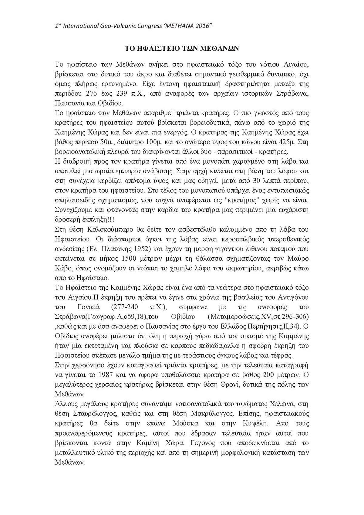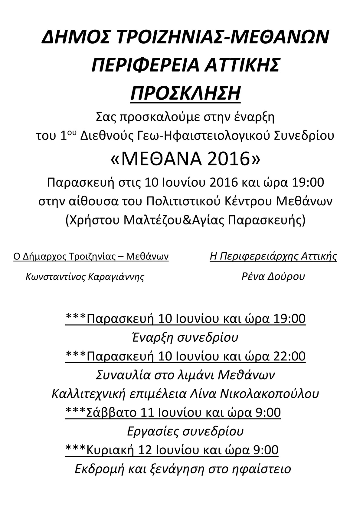 Πρόσκληση στην έναρξη του 1ου Διεθνούς Γεω‐Ηφαιστειολογικού Συνεδρίου «ΜΕΘΑΝΑ 2016» την Παρασκευή στις 10 Ιουνίου 2016 και ώρα 19:00