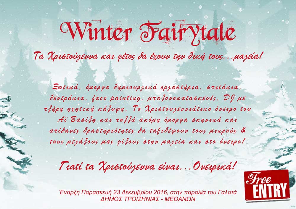 Για τρίτη συνεχή χρονιά ο Δήμος Τροιζηνίας-Μεθάνων διοργανώνει Winter Fairytale - Χριστουγεννιάτικες εκδηλώσεις.