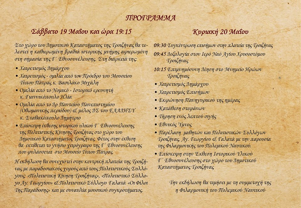 Το χειρόγραφο της Γ’ Εθνοσυνέλευσης της Τροιζήνας φυλάσσεται στο Μουσείο Τύπου της ΕΣΗΕΠΗΝ, στην Πάτρα. Την ημερομηνία της Εθνοσυνέλευσης έγραψε σε πλάκα ο Γέρος του Μωριά, Θεόδωρος Κολοκοτρώνης, που βρέθηκε στη σχισμή του κορμού ενός δένδρου, κάπου προς το Βίδι.